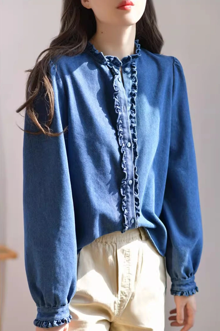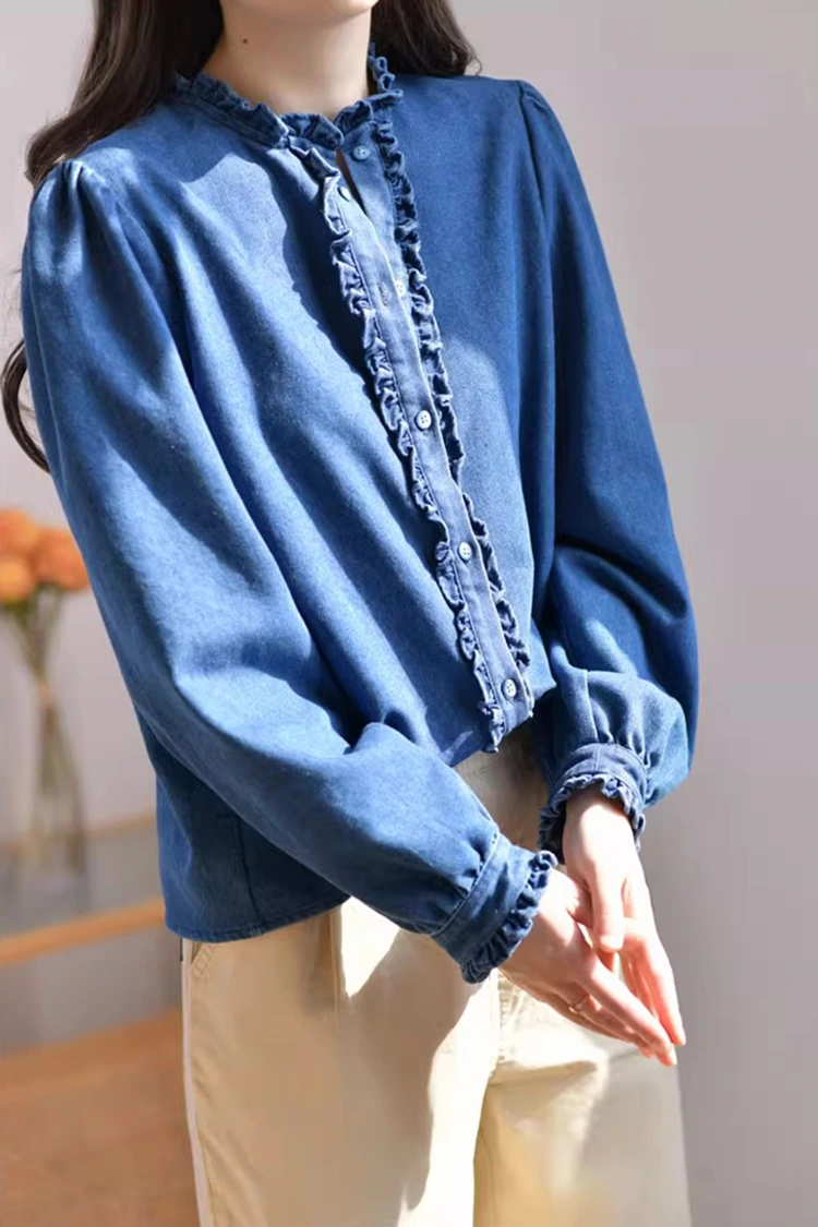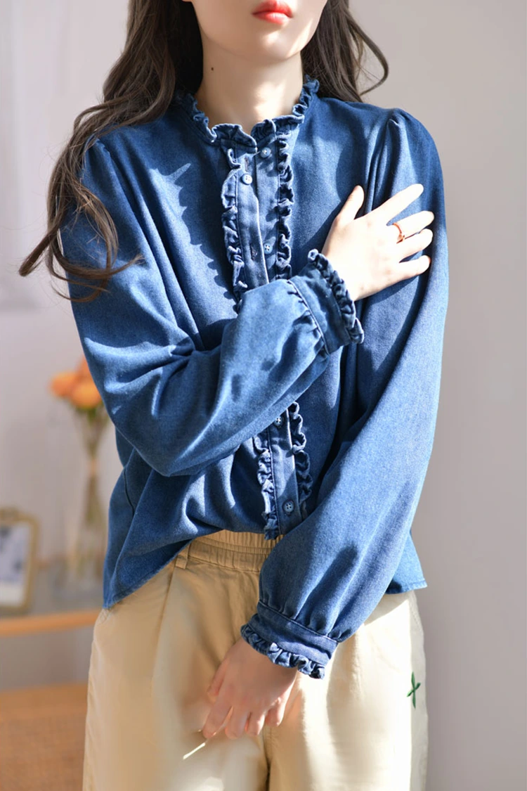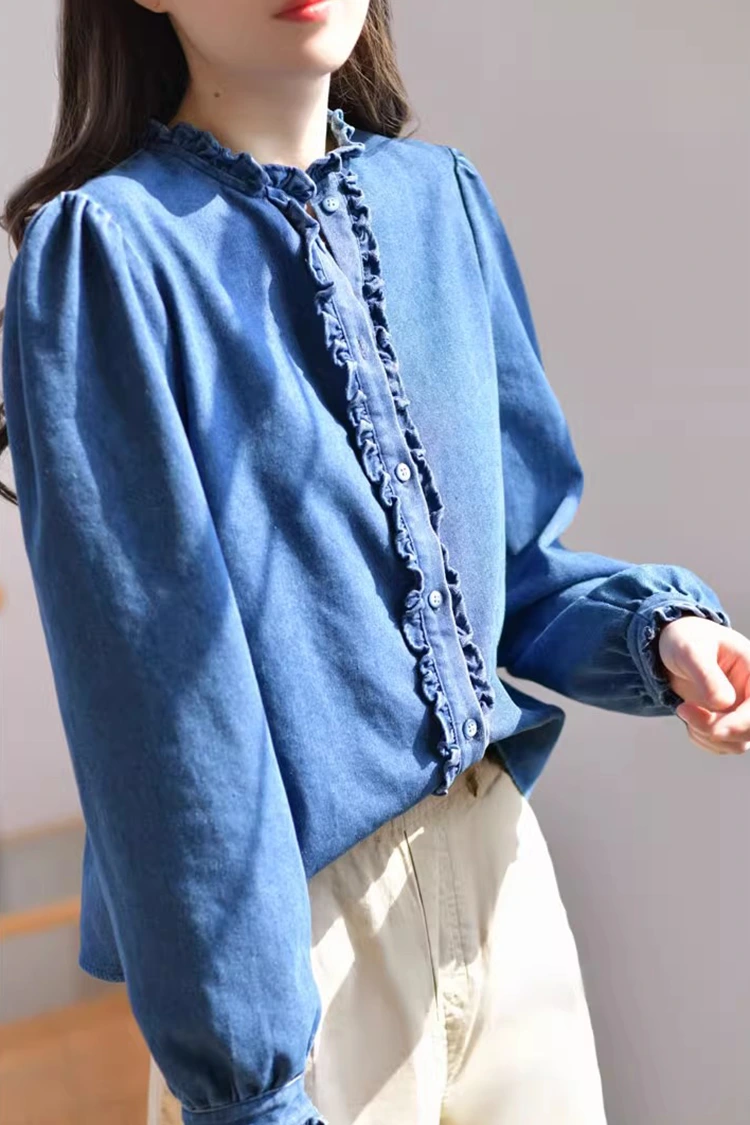 เสื้อเบลาส์ลำลองผ้าเดนิมสำหรับผู้หญิงมีดีไซน์ลวดลายย้อนยุคและลำลอง ซึ่งเข้ากับรูปร่างของผู้หญิงได้อย่างแม่นยำ ไม่ได้ขึ้นอยู่กับรูปร่างและไม่เพียงแต่ช่วยปรับแนวไหล่และคอ แต่ยังช่วยซ่อนไขมันส่วนเกินบริเวณเอวและหน้าท้องอีกด้วย ตอบโจทย์ความต้องการของร่างกายประเภทต่างๆ ส่วนปกเสื้อได้รับการออกแบบให้เป็นปกตั้ง จับคู่กับขอบจับจีบอันวิจิตรงดงาม ช่องเปิดด้านหน้าและข้อมือก็ตกแต่งด้วยขอบจับจีบอันละเอียดอ่อน เมื่อผสมผสานกับแขนยาวฟูฟ่องรูปโคมไฟ ผสมผสานความสง่างามแบบย้อนยุคและความสบายๆ ในสไตล์ลำลองได้อย่างลงตัว รูปแบบสีทึบที่เรียบง่ายมีความคลาสสิกและทนทาน และจะไม่ตกยุค มันสามารถสร้างลุคลำลองประจำวันหรือสไตล์ธุรกิจที่เรียบง่าย และใช้งานได้จริงอย่างมาก