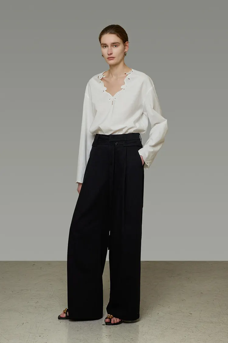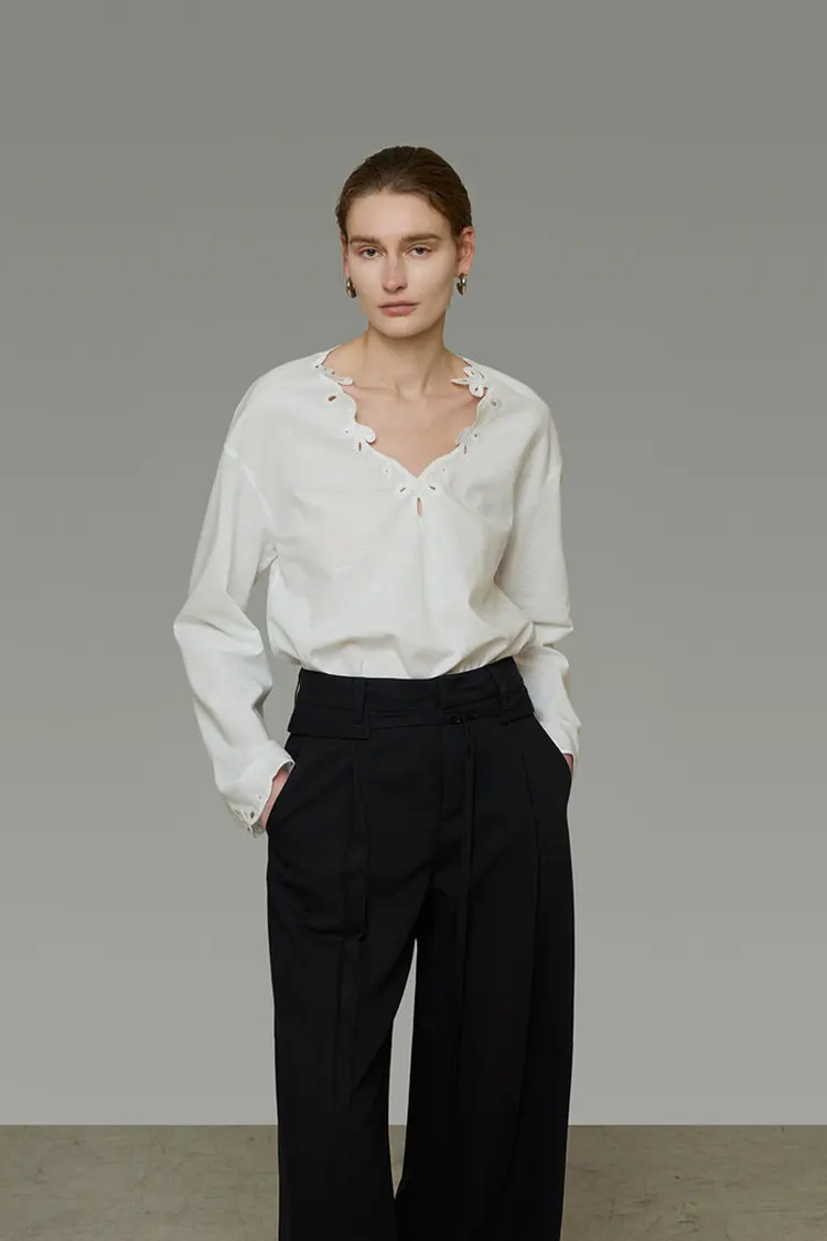 พื้นหลังแบบมินิมอลเน้นรายละเอียดงานปักและคัตเอาท์ ทำให้เป็นเสื้อผ้าอเนกประสงค์พร้อมความหรูหราแบบเรียบง่าย