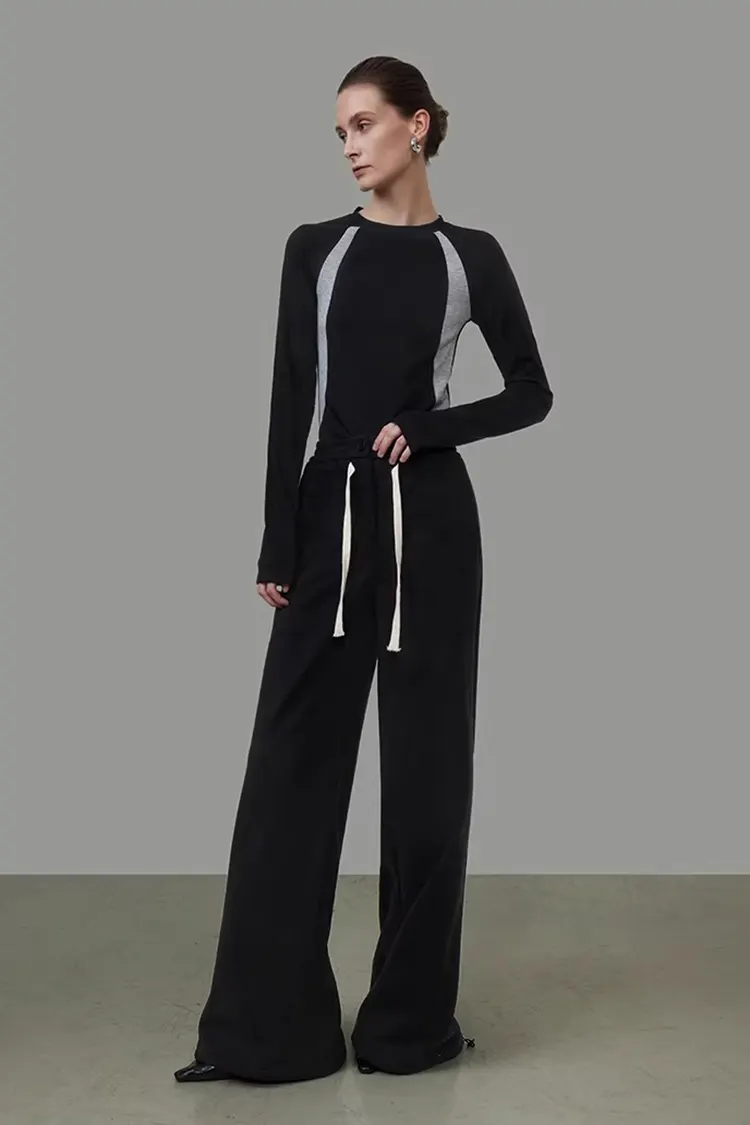 เราใช้สไตล์กางเกงขากว้างรูปไมโคร A และการตัดสามมิติสามมิติ หลังจากปรับรายละเอียดหลายครั้ง รูปร่างก็เข้ากับรูปร่างของคนเอเชียได้ใกล้ชิดยิ่งขึ้น การออกแบบเอวสูงและเอวกว้างช่วยยกรอบเอวได้อย่างมีประสิทธิภาพ ผสมผสานกับเชือกรูดที่หย่อนคล้อยอย่างเป็นธรรมชาติ ทำให้เรียบง่ายและเรียบร้อยโดยไม่ทำให้เทอะทะ รูปร่างกางเกงมีผลกระทบอย่างมากต่อเอว หน้าท้อง สะโพก และขา สามารถรองรับรูปร่างได้หลากหลาย และสามารถนำเสนอสัดส่วนที่เพรียวบางและอารมณ์ที่หรูหราได้อย่างง่ายดาย