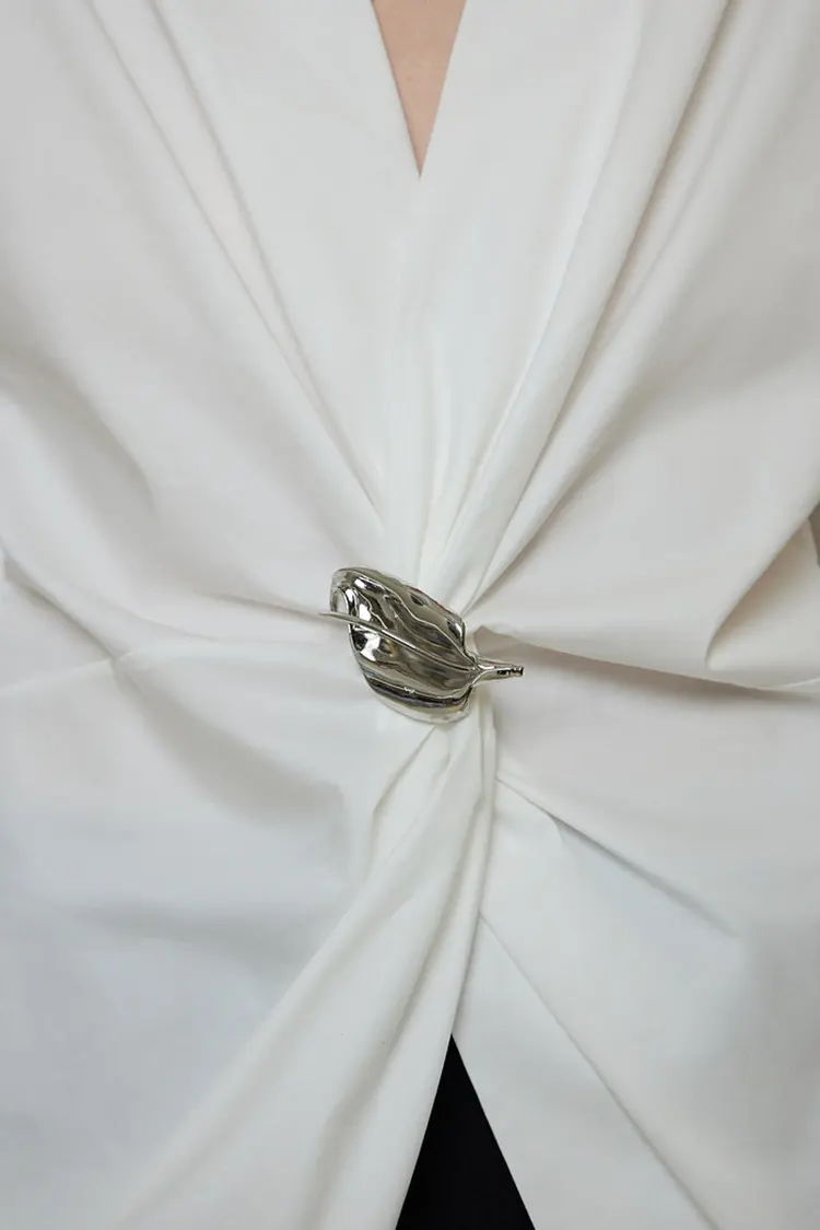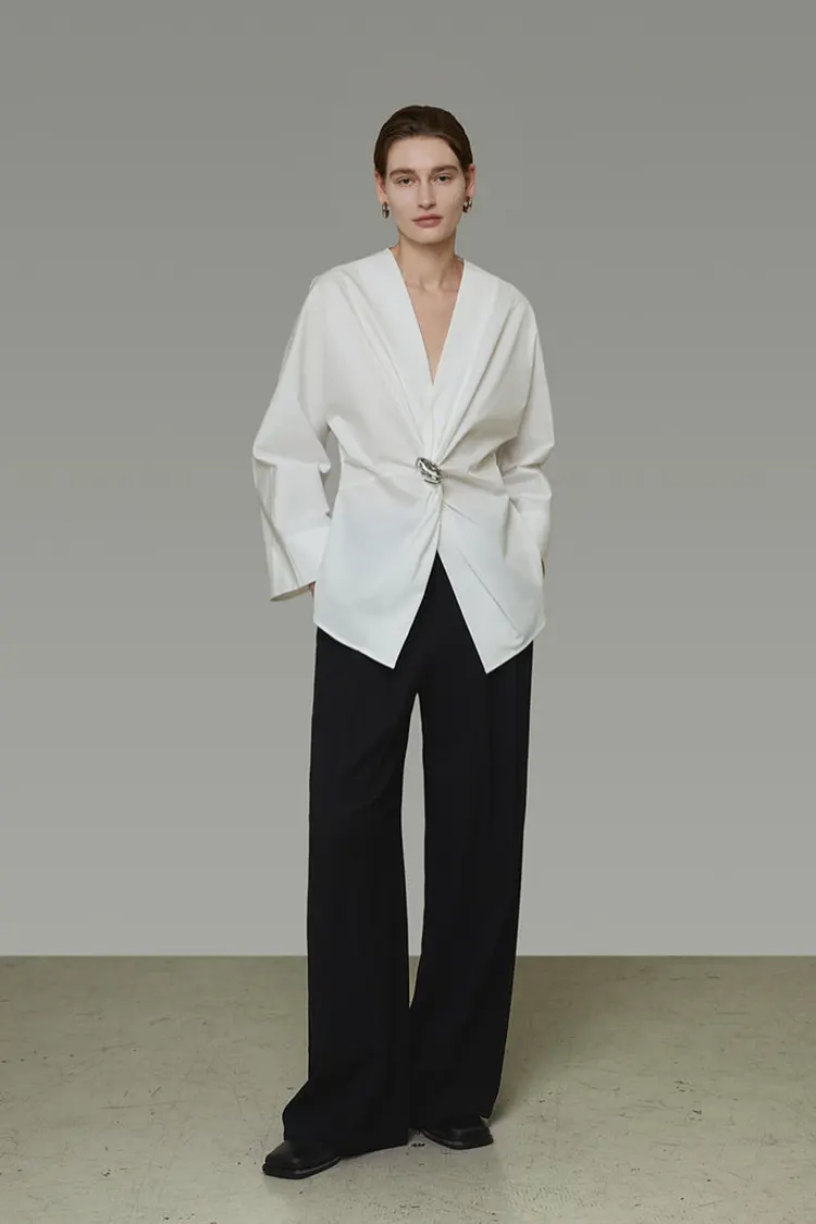 เสื้อเบลาส์ปาร์ตี้หัวเข็มขัดโลหะสำหรับผู้หญิงโดดเด่นด้วยปมเอวที่ไม่สมมาตรรวมกับกระดุมโลหะสามมิติสำหรับการตกแต่ง การเน้นการมองเห็นมีความโดดเด่น โดยเน้นที่รอบเอวและเน้นส่วนโค้งอย่างเป็นธรรมชาติ นอกจากนี้ยังใช้การจับจีบเพื่อทำให้รูปร่างดูนุ่มขึ้น ซึ่งให้ความยืดหยุ่นในระดับสูงสำหรับรูปร่างประเภทต่างๆ คอวีไขว้ดูเรียบร้อยและหรูหราด้วยผ้าที่คมชัดและเรียบลื่นซึ่งมีน้ำหนักเบาและไม่ยุบตัว เป็นการผสมผสานการใช้งานจริงของเสื้อเชิ้ตสำหรับการสวมใส่ในแต่ละวันเข้ากับความน่าดึงดูดทางแฟชั่นของเสื้อปาร์ตี้ ทำให้สวมใส่ได้หลากหลายและมองเห็นได้ชัดเจน