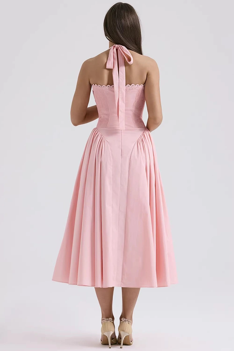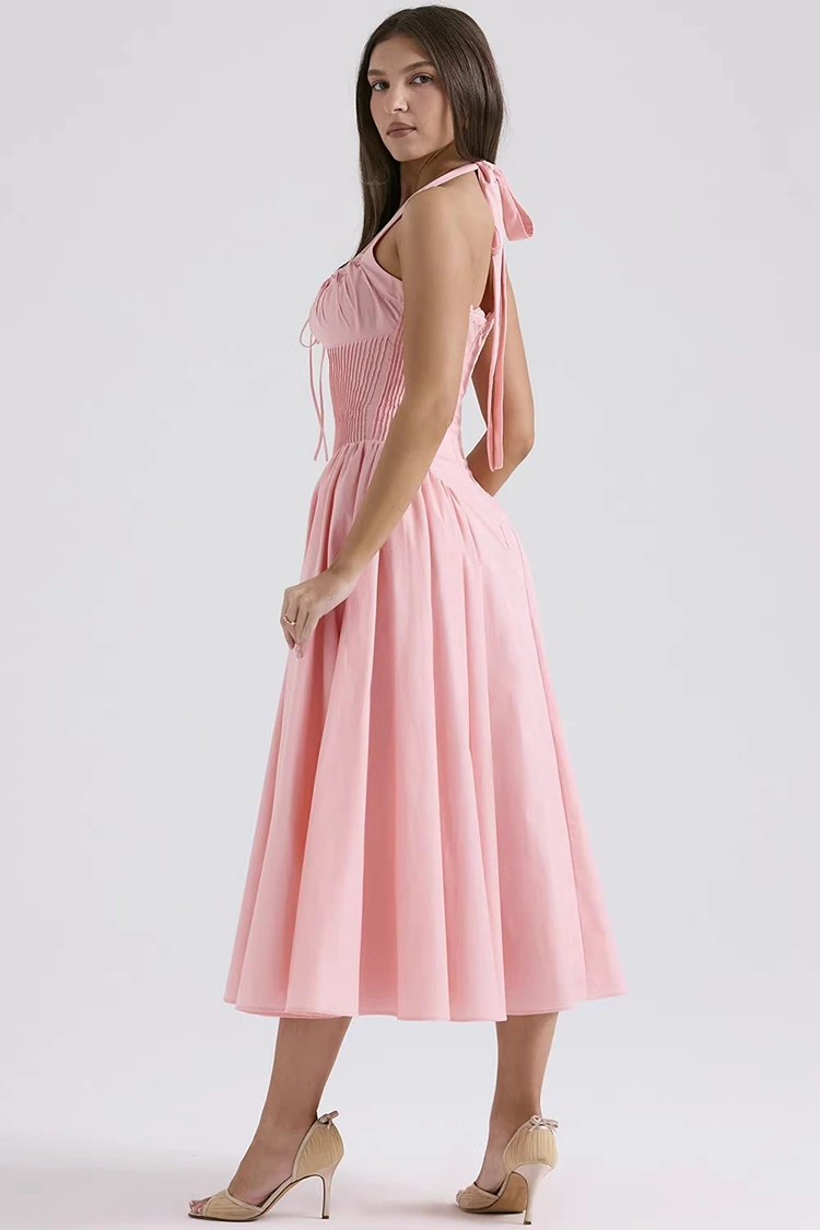 ชุดเดรส MIDI ผ้าฝ้ายสีชมพูสำหรับผู้หญิง