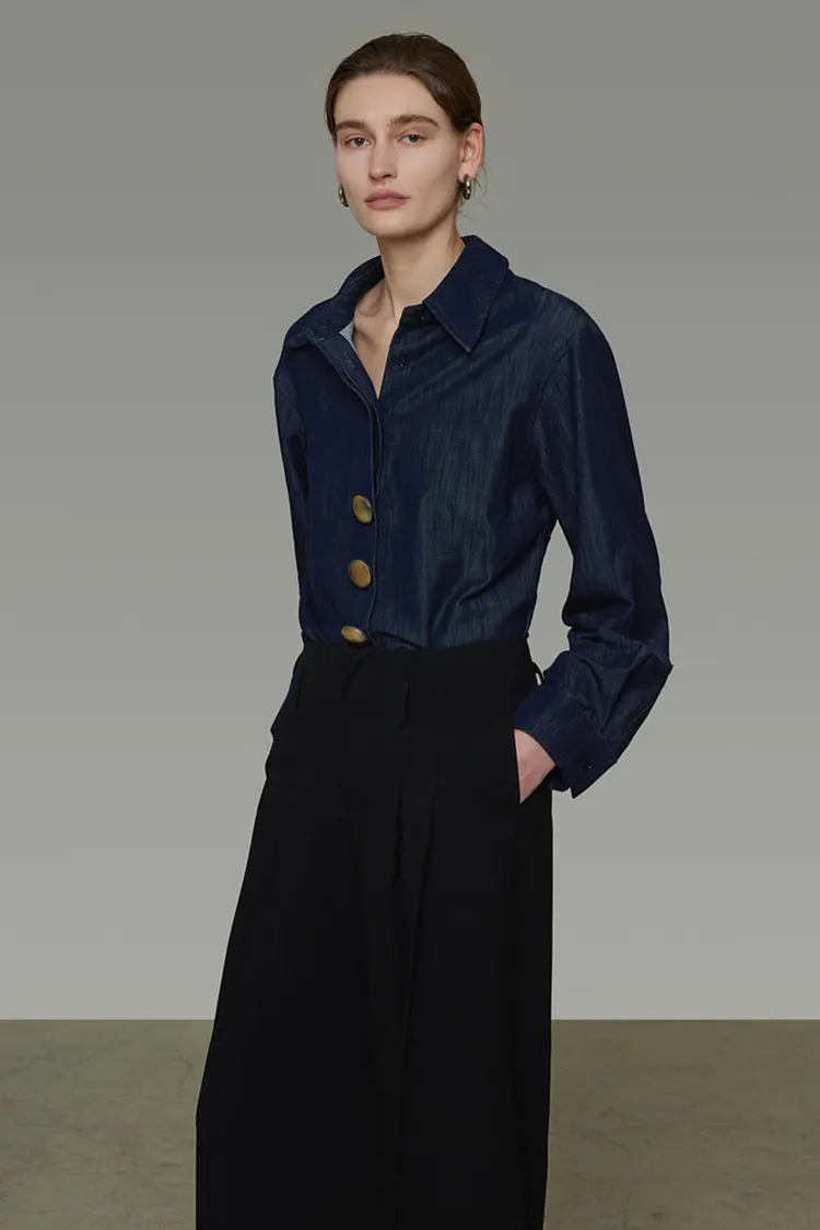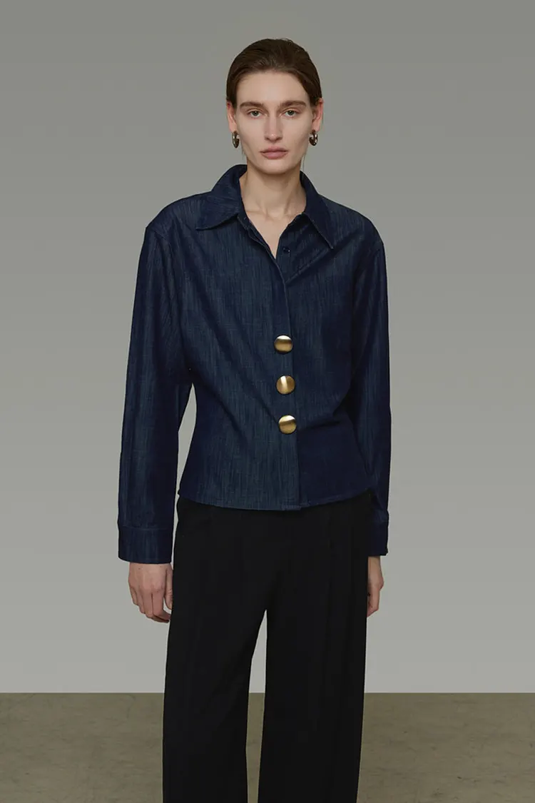 เสื้อเชิ้ตยีนส์วินเทจของผู้หญิงพร้อมกระดุมโลหะ เสื้ออเนกประสงค์แขนยาวที่เรียบง่ายและสวยงาม