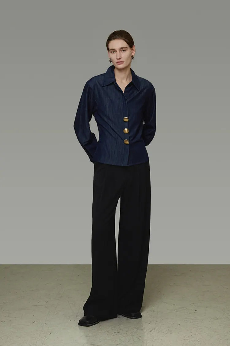 ตัวเสื้อผ้ามีรายละเอียดรอบเอวที่มองไม่เห็น ซึ่งสามารถเน้นรอบเอวได้อย่างเป็นธรรมชาติ และปกปิดข้อบกพร่องเล็กๆ น้อยๆ รอบเอวและหน้าท้องได้อย่างชำนาญ เมื่อมองเห็นจะดูเพรียวบางและคล่องตัวยิ่งขึ้น ด้านหน้าเสริมด้วยกระดุมโลหะขนาดใหญ่เป็นจุดเด่นในการตกแต่ง เป็นแบบย้อนยุคและประณีต ด้วยเนื้อผ้าที่โดดเด่น ทำให้เสื้อเชิ้ตธรรมดาไม่ซ้ำซากจำเจอีกต่อไป สร้างสไตล์การแต่งตัวที่เรียบง่ายแต่ซับซ้อนได้อย่างง่ายดาย