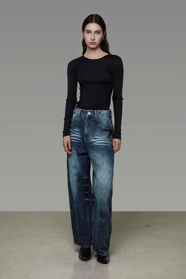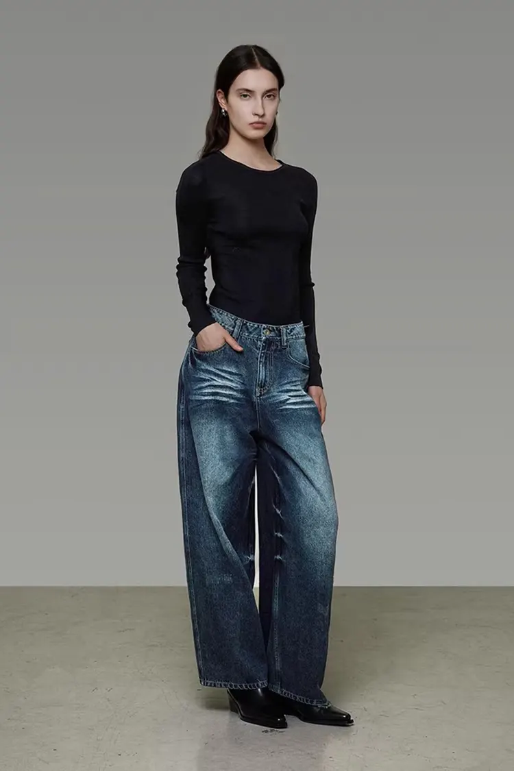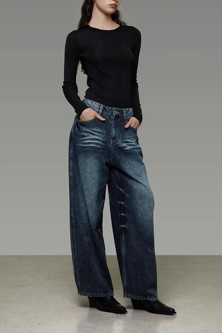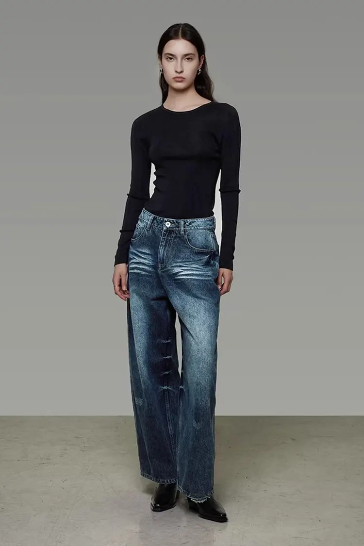 กางเกงขากว้างผ้าเดนิมฟอกสำหรับผู้หญิงโดดเด่นด้วยดีไซน์เอวสูงคลาสสิก ผสมผสานกับทรงขากว้างหลวม ให้การปกปิดบริเวณขาที่สูงมากและสามารถปกปิดจุดบกพร่องเล็กๆ น้อยๆ บนขาได้อย่างเป็นธรรมชาติ กางเกงจะหลุดออกจากเอวลงมาอย่างเป็นธรรมชาติ และพลิ้วไหวอย่างสง่างามและอิสระขณะเดิน ภาพรวมดูเรียบร้อยไม่ยุ่งยากหรือป่อง มันสามารถยืดเส้นขาและสร้างบรรยากาศย้อนยุคที่หรูหราและลำลอง เหมาะสำหรับทั้งชุดทำงานและชุดประจำวัน