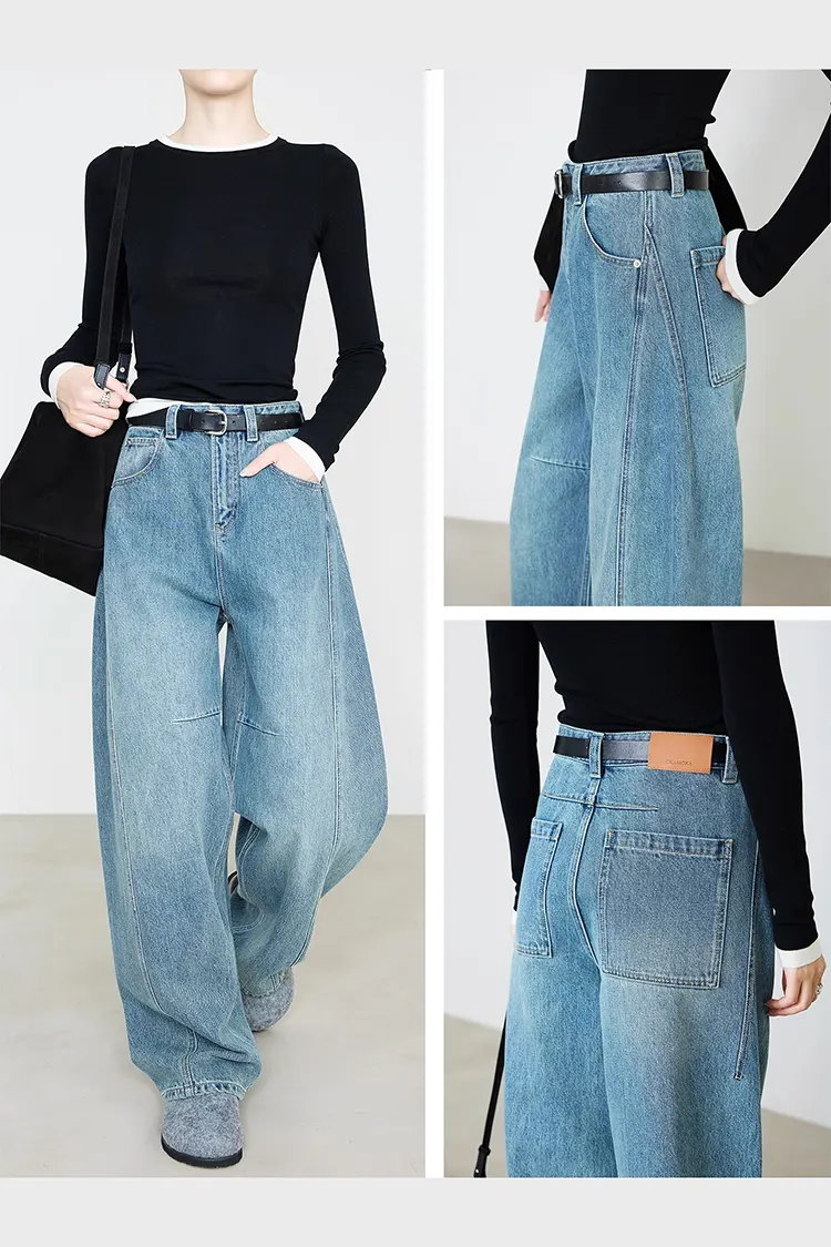 กางเกงยีนส์ขากว้างผู้หญิงผลิตจากผ้าฝ้ายแท้ 100% โดดเด่นด้วยการระบายอากาศและความนุ่มเป็นเลิศ อ่อนโยนต่อผิว สวมใส่สบายและไม่ทำให้รู้สึกร้อนแม้สวมใส่เป็นเวลานาน ช่วยให้คุณเย็นสบายในช่วงอากาศร้อนและให้ความอบอุ่นเพียงพอในวันที่อากาศเย็น